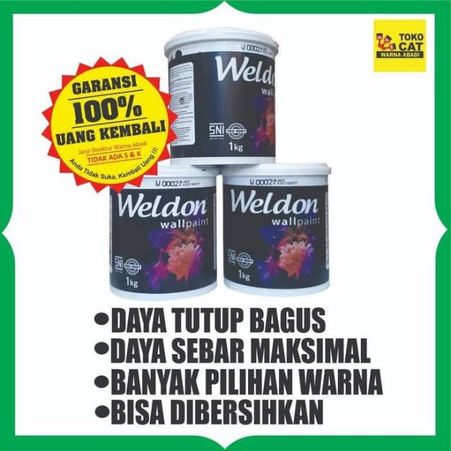 Cat Tembok Weldon adalah cat tembok Acrylic Emulsion yang diformulasikan untuk pengecatan dalam ruangan dengan perpaduan warna - warna yang menarik sehingga menghadirkan keindahan dan kenyamanan.KEUNGGULAN- Banyak pilihan warna warna yang menarik- Daya tutup bagus- Mudah dibersihkan dari noda- Daya sebar maksimumUKURAN KEMASAN :- 1 KgPILIHAN WARNA :- Sesuai warna di katalog ( swipe gambar )PENGENCERAN :- AirDAYA SEBAR :- 12 m2 / KgAnda Tidak Cocok dengan Kualitasnya, Bisa DITUKAR !!!Garansi 100% Uang KembaliBuktikan Janji Direktur Warna AbadiTidak Ada Syarat & KetentuanKualitas Cat Jelek, Langsung Kami GANT