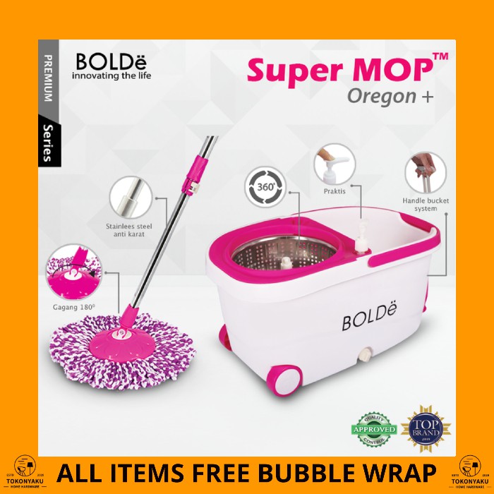 GRATIS : PACKING BUBLE WRAP.PILIHAN WARNA-PUTIH LIS PINK-BEIGEHanya BOLDe Super MOP Original.Super MOP BOLDe Tipe OREGON ada= Roda + Tarikan, Stainless bagian Pembilas, Tempat pewangi dan corong Pembuangan airIsi kelengkapan dalam 1 paket.- 1 tongkat- 1 kepala pel- 2 refill mop- 1 Ember- 1 buku petunjuk pemasangan.Sekarang mengepel tidak perlu mengotori tangan lagidengan alat pel praktis dan otomatis Super MOP