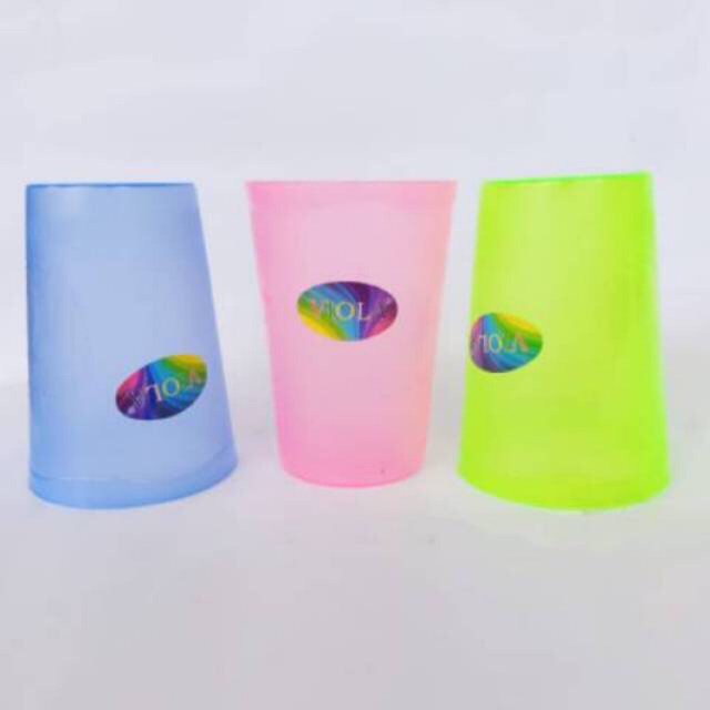 Gelas/Cangkir Plastik Manggis.Aman, elastis, kuat, kemasan menarik, cocok untuk rumah makan / pedagang kelilingSatu lusin terdiri 3 warna (pink, hijau, dan biru )Diameter : 9