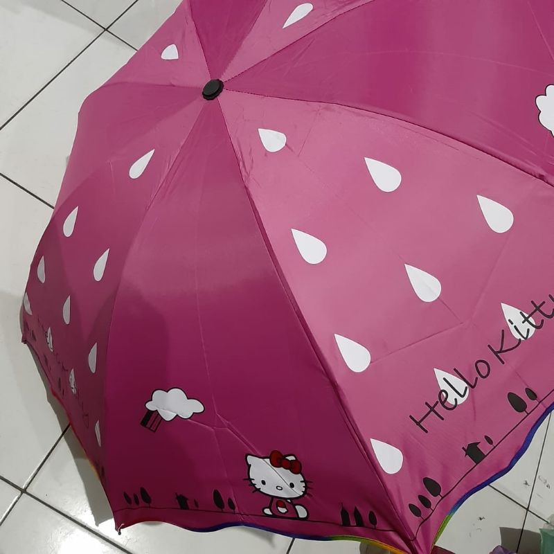Rangka kuat , batang lebih besar , jari2 dicat hitam (tahan karat )Anti anginlapisan anti UV (SILVER)Diameter saat dibuka 95 Cm , panjang saat dilipat 25 Cm, mudah masuk tasWarna cerah , motif Hello Kitty.Cocok digunakan saat musim hujan maupun musim panasKecil , praktis , ringan , mudah dibawa kemana