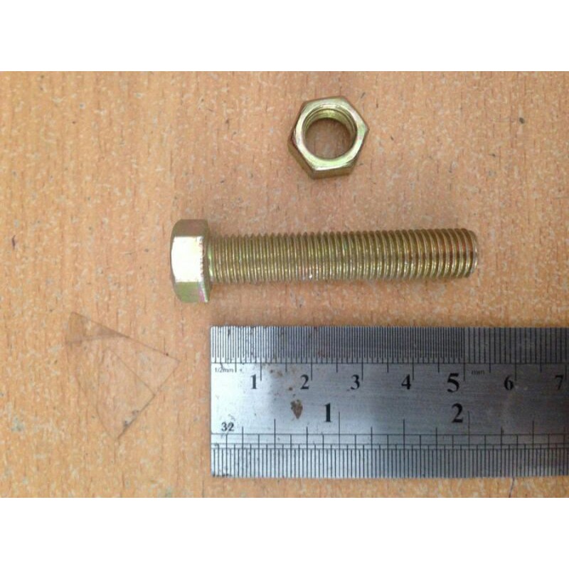 Baut Mur Kuning M10 X 50Diameter: 10mmPanjang: 50mmKunci: 14Drat: 1.25Finishing: Galvanis Kuning (YZP)Termasuk MurMerk: TMS/ Moon Lion/ Panaports/ Mega