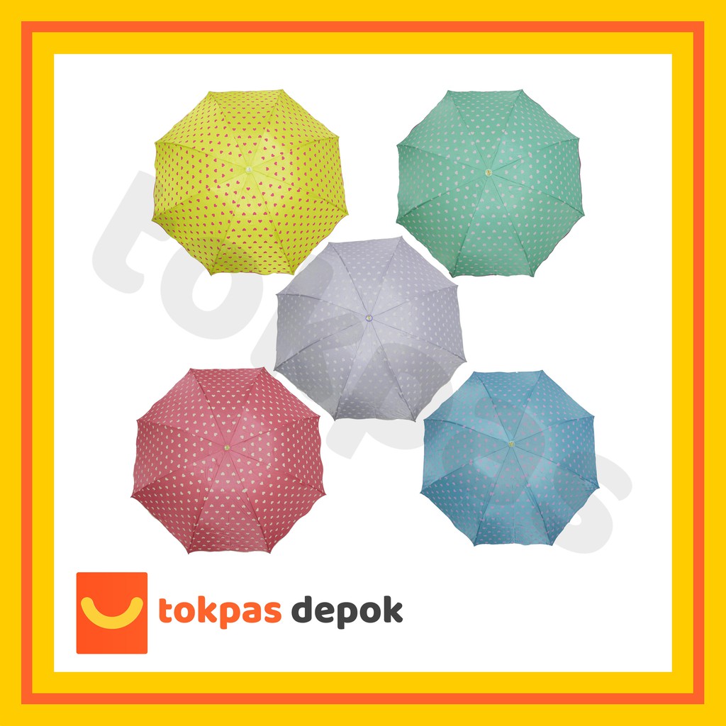READY STOCK!!! Payung Lipat Sarung Motif Hati HeartPayung ini cocok untuk cuaca hujan maupun panasWARNA : 1. Pink 2. Hijau3. Biru4. Ungu5. KuningBerat = 281 gramUkuran Panjang : 25 cm (kondisi dilipat)Ukuran Tinggi : 64,5 cm (kondisi dibuka)Diameter Payung : 92 cm (kondisi dibuka)Warna Gagang: Hit