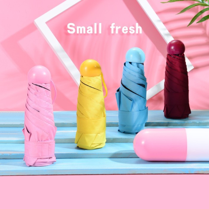 Sudah termasuk kapsul/sarung/dompetnyaSedia payung sebelum hujan, payung unik yang sedang hits ditahun 2021 adalah payung bentuk kapsul, bentuknya yang bisa dlipat bberapa kali membuat nya mudah dibawa kemanapun, tidak sperti payung biasa yang ribet bawanya. Payung ini masuk kedalam tas sekolah, cabin mobil, jok motor, dan lainnya.DESKRIPSI Mudah dibawa kemana-mana Cocok untuk disimpan di motor dan mobil Bahan lapis hitam Anti UV Rangka 6 jariSPESIFIKASI :Material : Waterproof VinylSaat TertutupPanjang: 19cm/6.69inch Tinggi : 6cm/1.77inchSaat TerbukaDiameter: 90cm/35.43inchTinggi: 51.5cm/20.27inchJumlah Tulang: 6 T