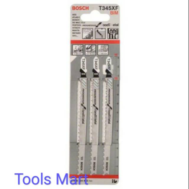 Jigsaw Blades for Wood and Metal T 345 XF BoschSpesifikasi :T 345 XF Progressor for wood and metalkayu konstrusi dengan paku : 65 kayu kasar : 65 fibre Glass : 3-10mmaluminium : 3-10mmpanjang : 132mmis