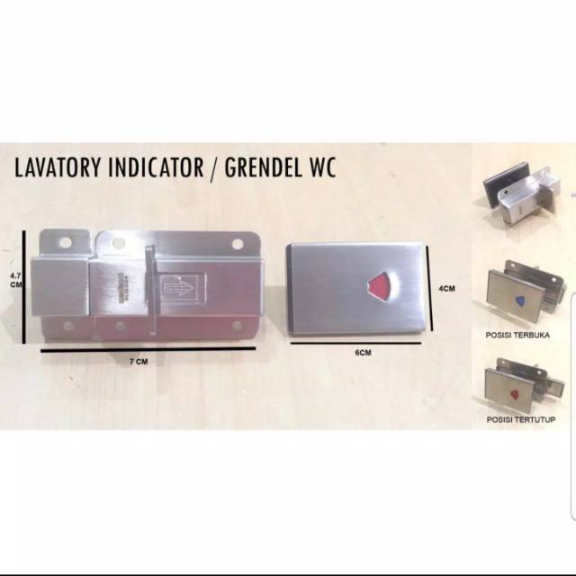 Lavatory Indicator Dekson / Grendel Indikator Pintu Kamar MandiSelamat datang di toko kamiMohon membaca deskripsi produk kami dengan teliti, karena kami tidak ingin mengecewakan anda sebagai pelanggan kami.Lavatory Indicator digunakan biasanya sebagai penanda apakah di dalam kamar mandi ada orang.posisi terkunci berwarna merah, berarti ada orang, posisi terbuka berwarna birusudah termasuk skrupmaterial stainless steelNote : KAMI SELALU MELAKUKAN CEK SEBELUM BARANG KAMI KIRIM KEPADA ANDA UNTUK MEMASTIKAN TIDAK ADA CACAT PRODUK DAN SAMPAI DI TANGAN ANDA DALAM KEADAAN BAIK-Mohon memasukkan nomor telepon yang valid dan alamat yang lengkap agar kami dapat melakukan konfirmasi dengan anda.-Cek dahulu sebelum memesan, kami tidak terima pergantian Nama, Nomor, Alamat, atau Barang setelah order-Mohon segera melakukan konfirmasi saat barang sudah diterima dan jangan lupa beri kami bintang 5 ya brow/sist. Penilaian anda sangat berharga bagi kami.Terima kasih telah belanja [di toko kami]> Langsung di order aja ya sis :)> Produk Ready Stock> Kunjungi toko kami dan cek barang-barang menarik yang lain> Terimakasih, Jangan Lupa Follow dan beri bintang 5Selamat BerbelanjaTHANK YOU & HAPPY SHOPPIN