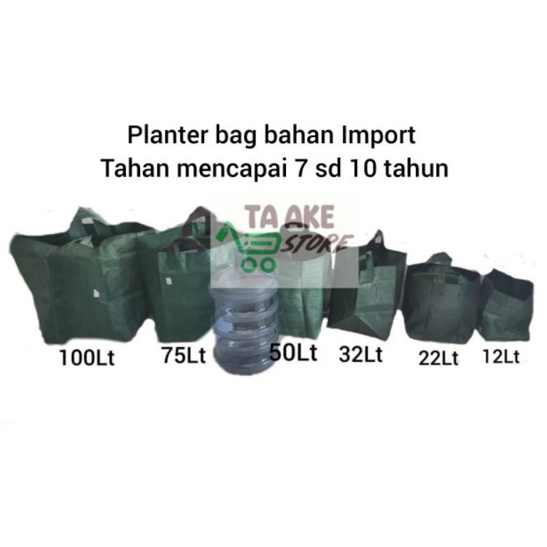 Ukuran yang Tersedia ada 6 Ukuran.Ada handle pengangan kecuali Ukuran Paling kecil 12 liter.125x25 (12lt) 230x30 (22Lt)335x35 (32Lt)440x40 (50Lt)545x45 (75Lt)650x50 (100Lt)Planter Bag atau tas tanaman Berkualitas bahan import kuat dan tebal tahan 7 - 10 Tahun: 1. Daya tahan planter bag yang lama mampu mencapai 10 tahun.2. Sirkulasi udara yang cukup menjadikan tanaman lebih cepat tumbuh dan berbuah3. banyak ukuran yang bervariasi menyesuaikan tanaman atau lahan yang tersedia.4. Dapat di lipat sebelum di pakai untuk meminimalisir lahan yang tersedia.5. Kuat terahdap cuaca apapun karena kualitas bahan premium di lapisi ultra violet.6. Lebih hemat pupuk karena akan di serap tanaman dan tidak akan di buang percu