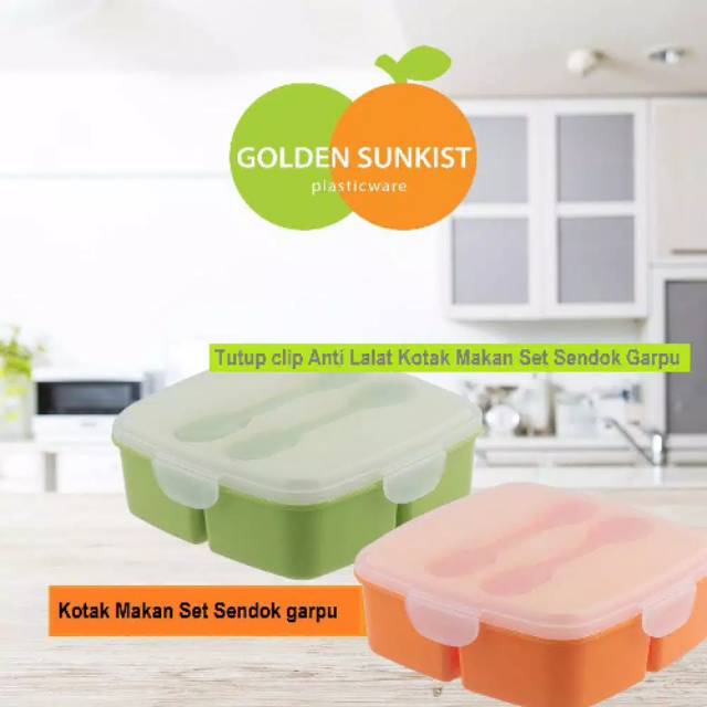Golden Sunkist Lunch Box Kotak Makan Sekat Tutup Dengan Sendok GarpuDimensi produk : 19 cm x 19 cm x 6 cm– Material : Plastik Food Grade– Terdapat : Tiga sekat makanan– Dilengkapi sendok makan dan garpu– Double Cap Dua tutupKeunggulan produk :- Food grade- Modern design- Colorful- Hot and Cold- Easy